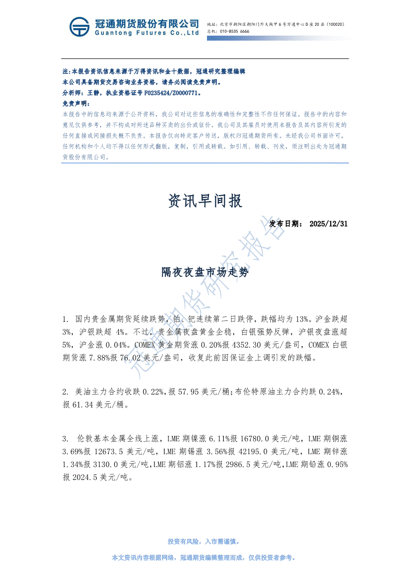 冠通期货-资讯早间报-251231