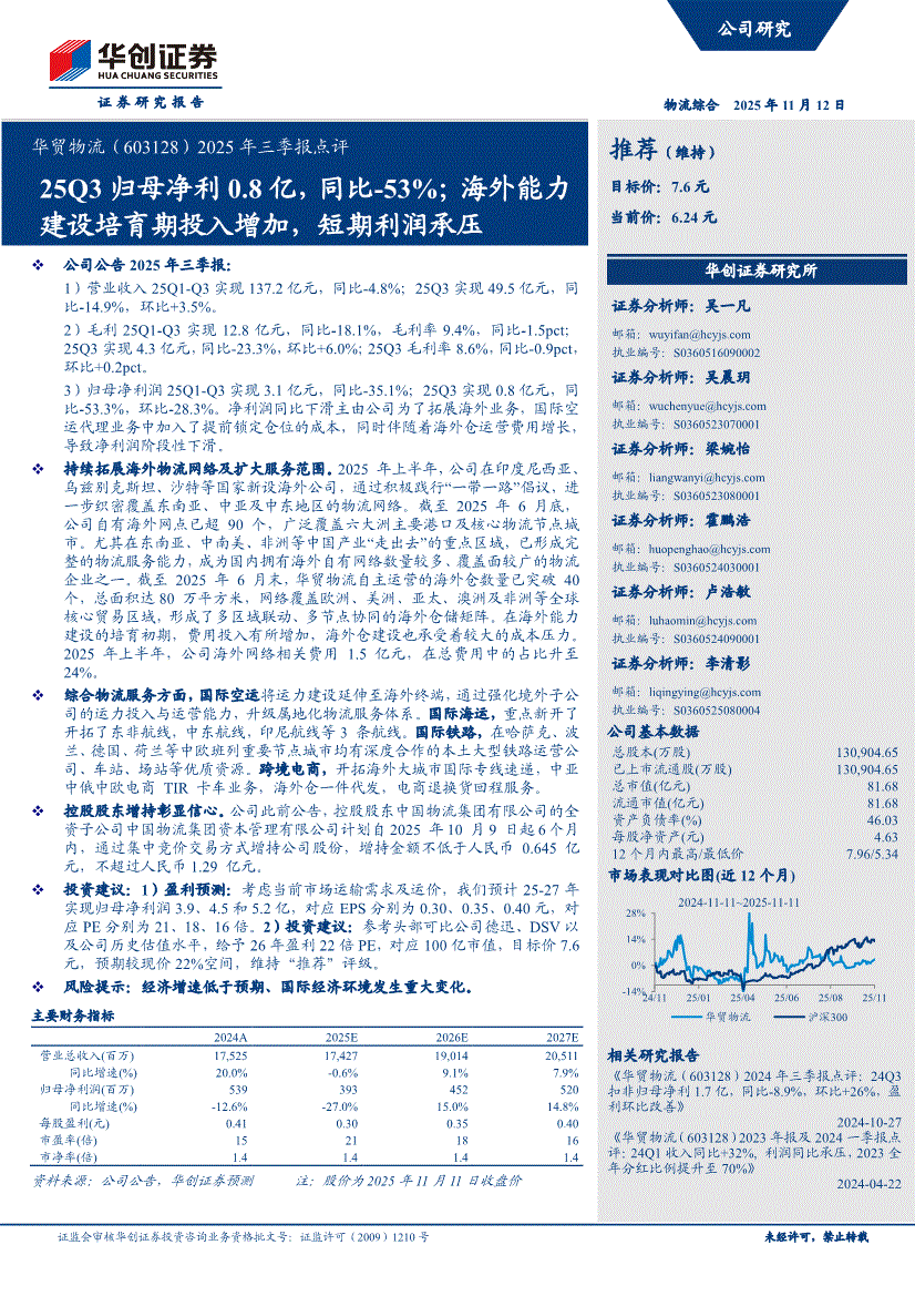 华贸物流:华创证券-华贸物流-603128-2025年三季报点评:25Q3归母净利0.8亿,同比负53%;海外能力建设培育期投入增加,短期利润承压-251112