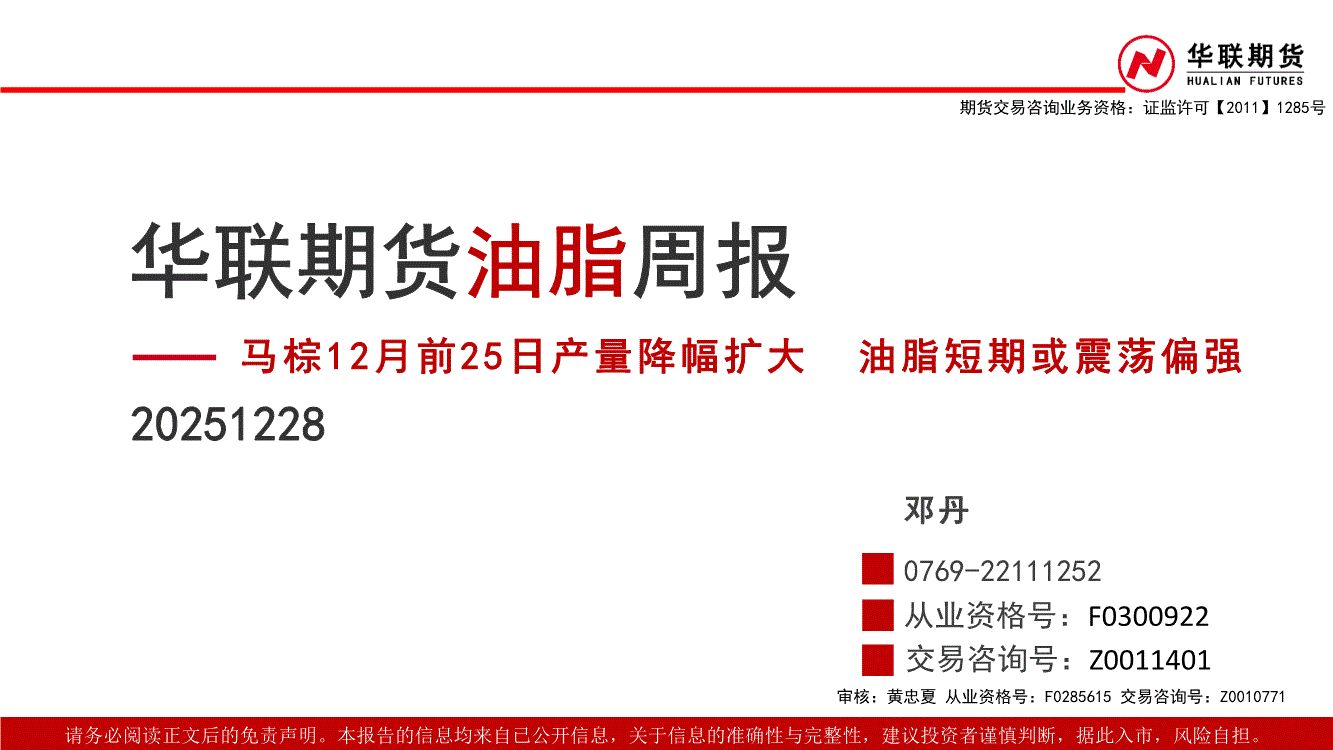 华联期货-油脂周报:马棕12月前25日产量降幅扩大,油脂短期或震荡偏强-251228