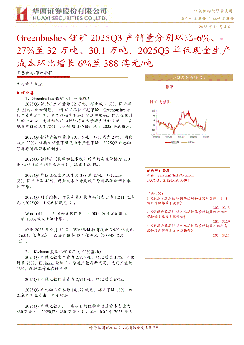 有色金属行业:华西证券-有色金属行业~海外季报:Greenbushes锂矿2025Q3产销量分别环比~6%、~27%至32万吨、30.1万吨,2025Q3单位现金生产成本环比增长6%至388澳元/吨-251104