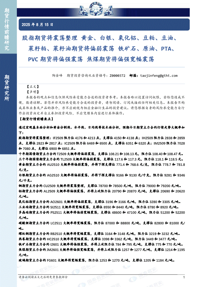 国泰君安期货-股指期货将震荡整理,黄金、白银、氧化铝、豆粕、豆油、菜籽粕、菜籽油期货将偏弱震荡,铁矿石、原油、PTA、PVC期货将偏强震荡,焦煤期货将偏强宽幅震荡-250815