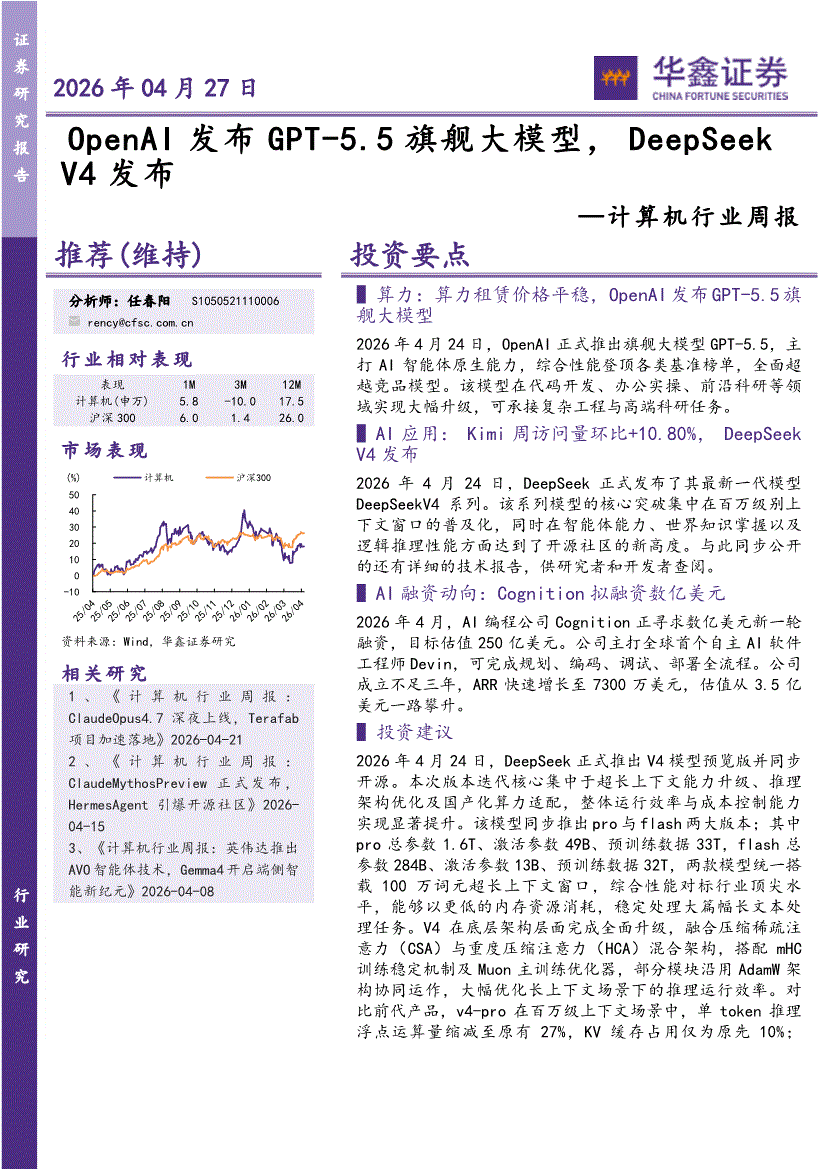 计算机行业:华鑫证券-计算机行业周报:OpenAI发布GPT~5.5旗舰大模型,DeepSeekV4发布-260427
