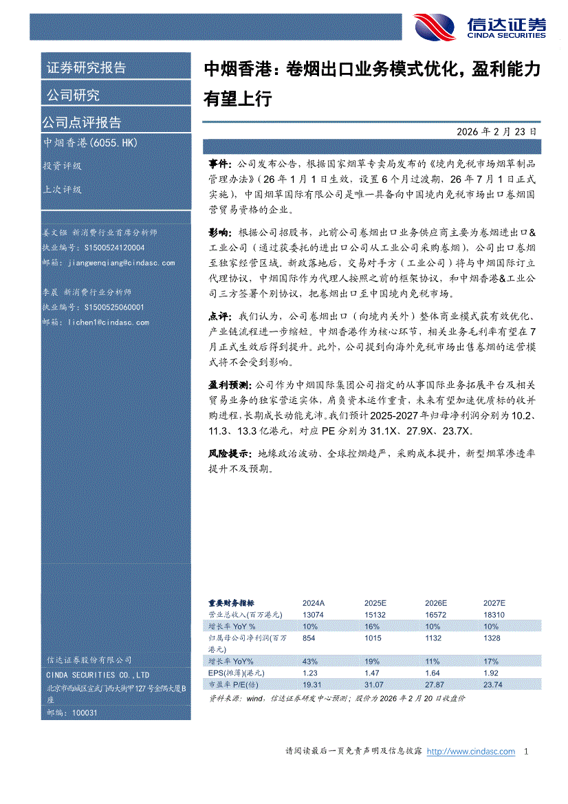 中烟香港:信达证券-中烟香港-6055.HK-卷烟出口业务模式优化,盈利能力有望上行-260223