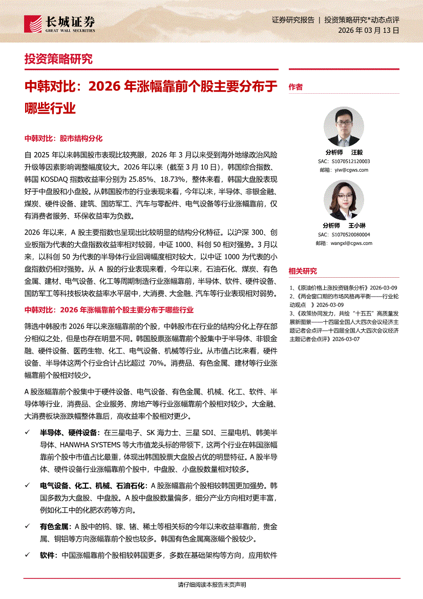 长城证券-中韩对比:2026年涨幅靠前个股主要分布于哪些行业-260313