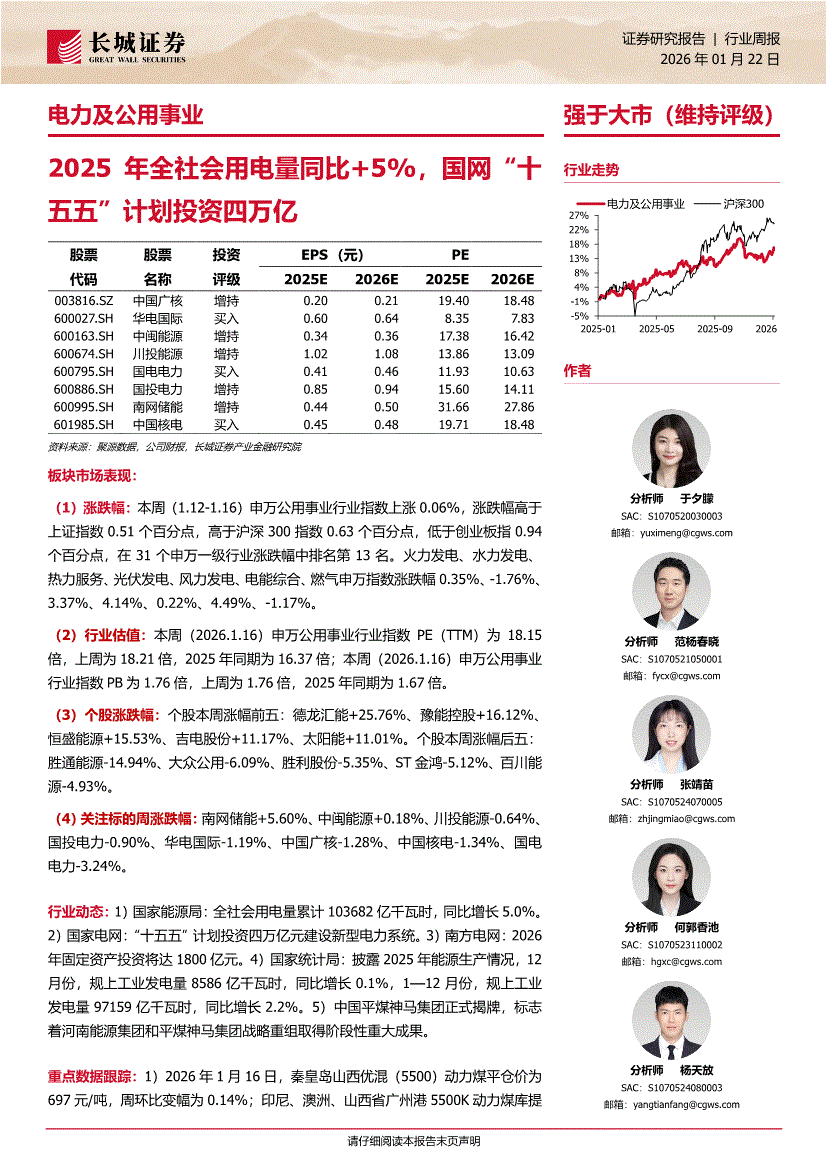电力及公用事业行业:长城证券-电力及公用事业行业周报:2025年全社会用电量同比+5%,国网“十五五”计划投资四万亿-260122