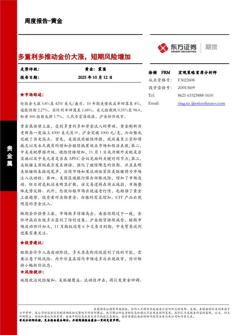 东证期货-黄金周度报告:多重利多推动金价大涨,短期风险增加-251012
