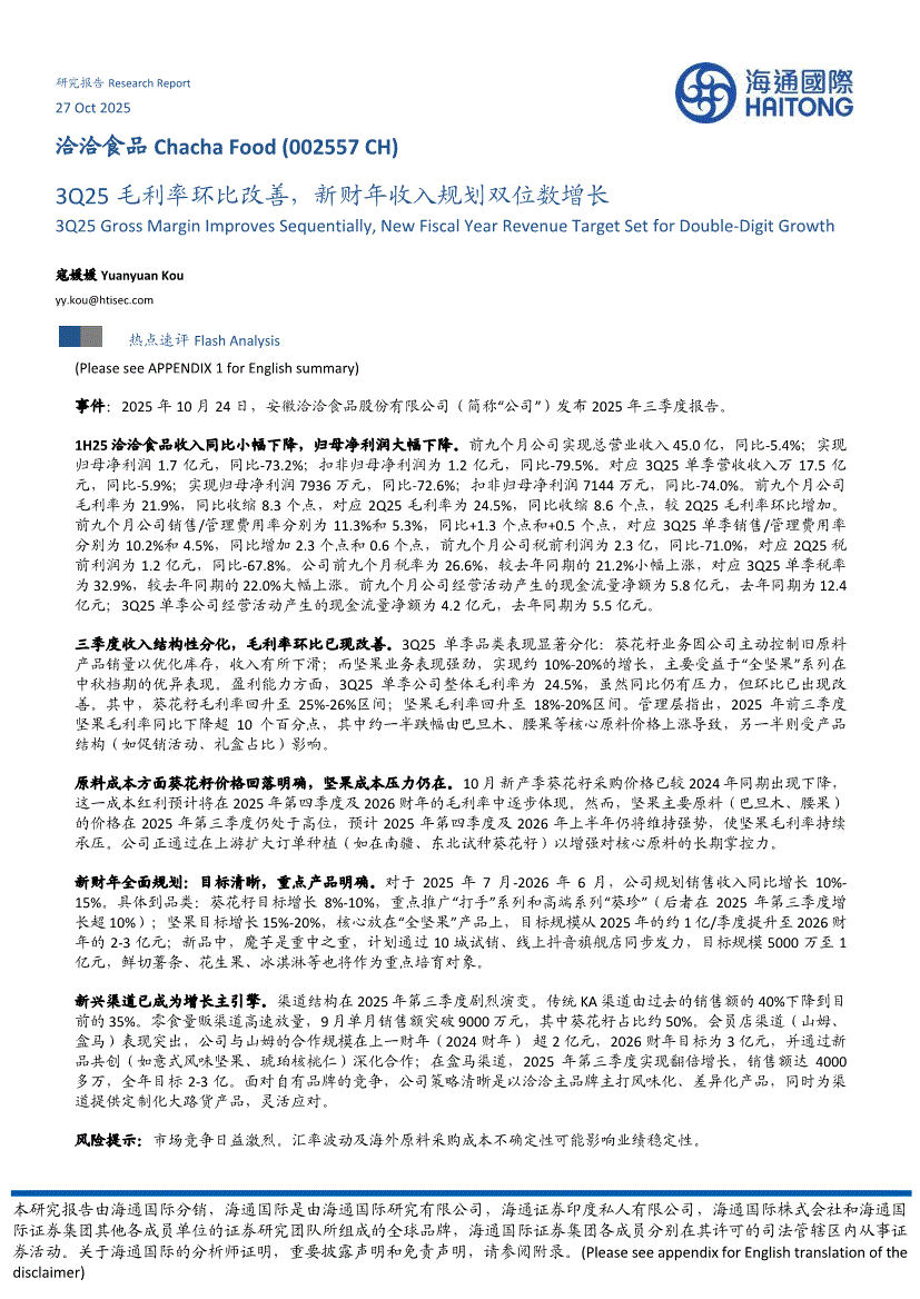 洽洽食品:海通国际-洽洽食品-002557-3Q25毛利率环比改善,新财年收入规划双位数增长-251027