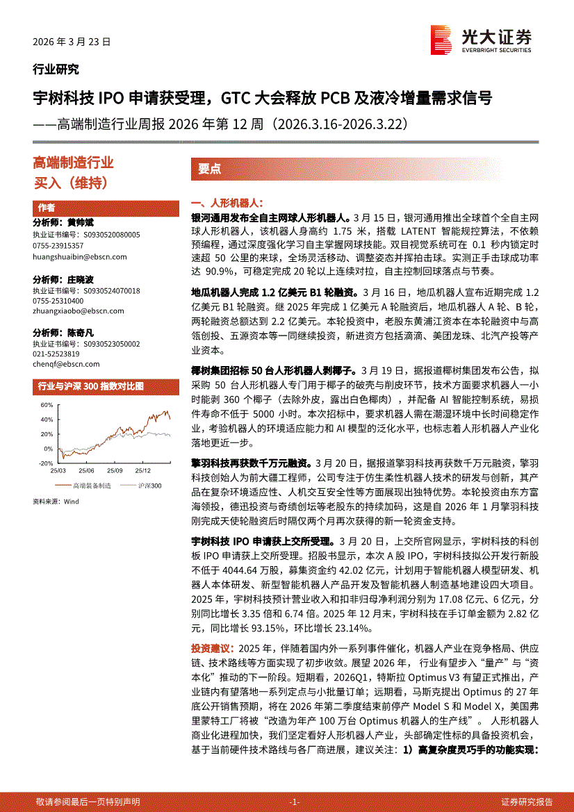 高端制造行业:光大证券-高端制造行业周报2026年第12周:宇树科技IPO申请获受理,GTC大会释放PCB及液冷增量需求信号-260323