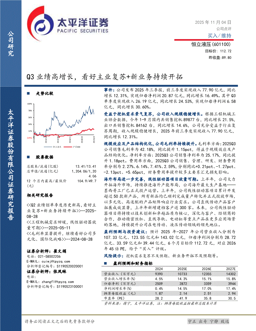 恒立液压:太平洋证券-恒立液压-601100-Q3业绩高增长,看好主业复苏+新业务持续开拓-251104