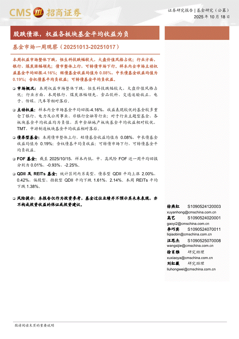 招商证券-基金市场一周观察:股跌债涨,权益各板块基金平均收益为负-251018