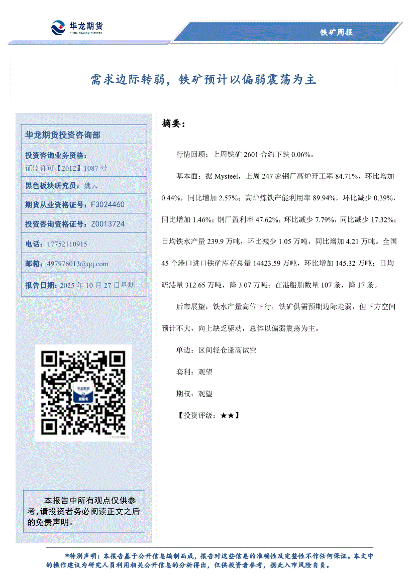 华龙期货-铁矿周报:需求边际转弱,铁矿预计以偏弱震荡为主-251027