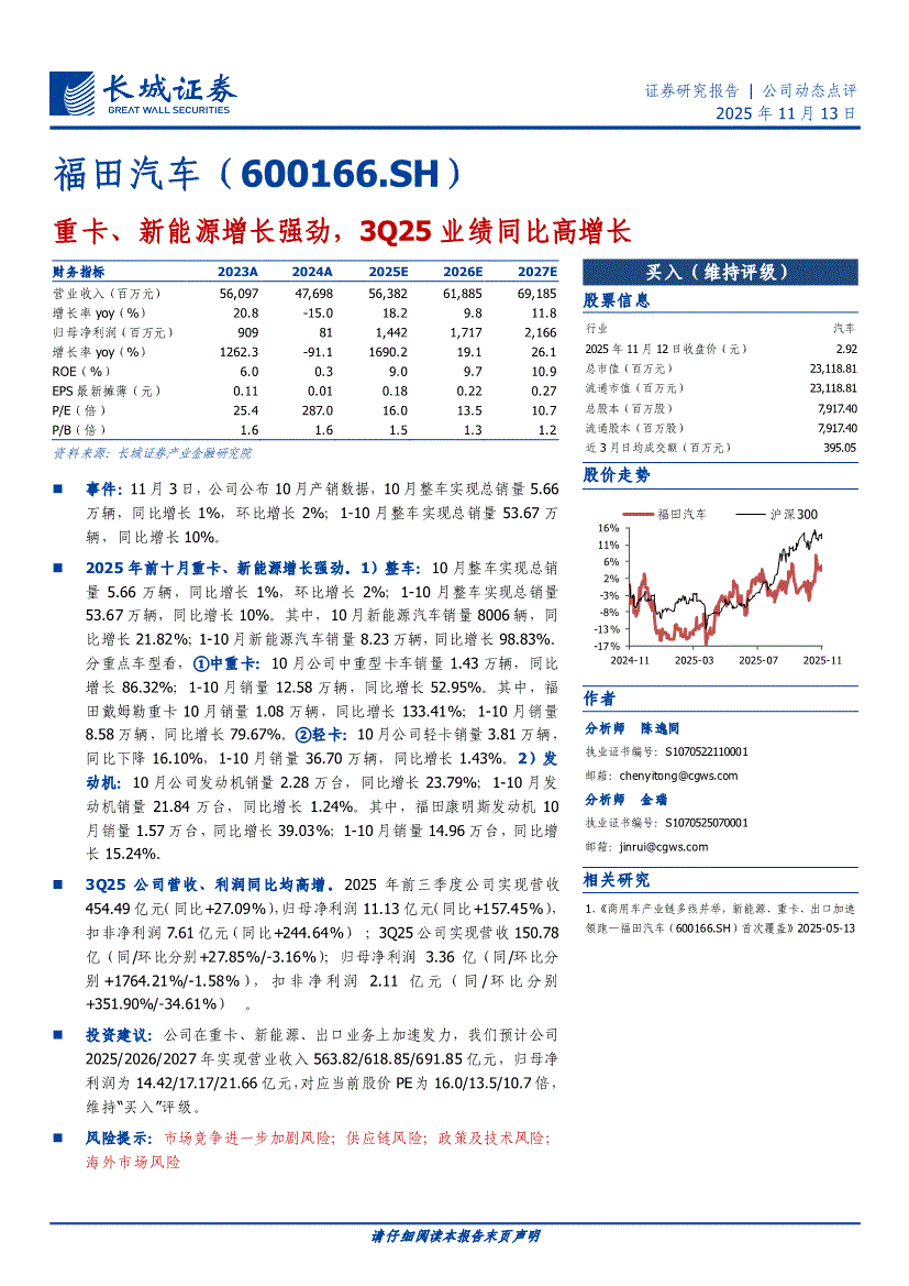 福田汽车:长城证券-福田汽车-600166-重卡、新能源增长强劲,3Q25业绩同比高增长-251113