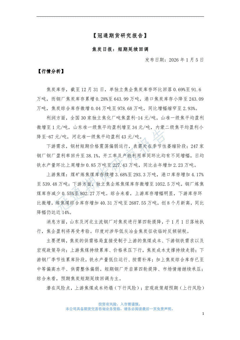 冠通期货-焦炭日报:短期延续反弹为主-260115