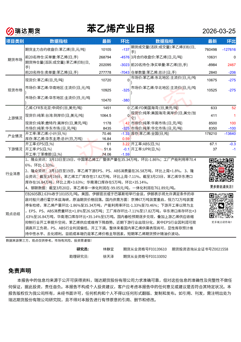 瑞达期货-苯乙烯产业日报-260325