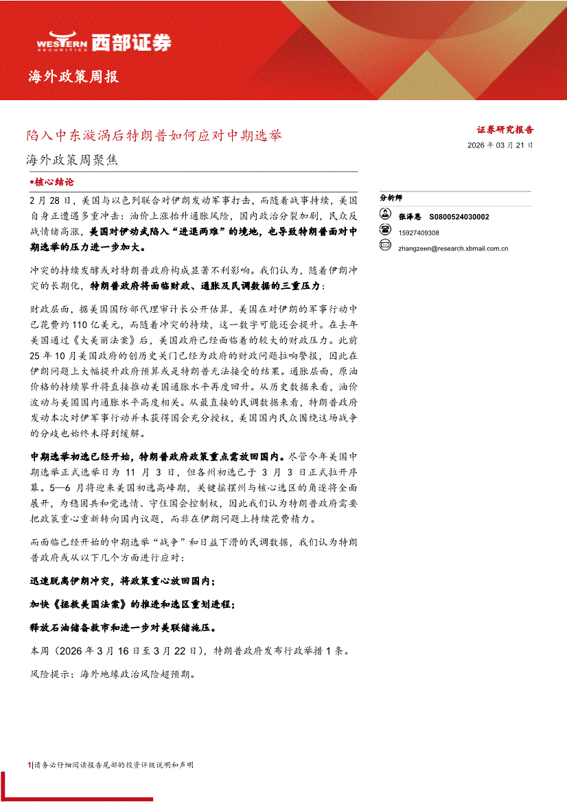 西部证券-海外政策周聚焦:陷入中东漩涡后特朗普如何应对中期选举-260321