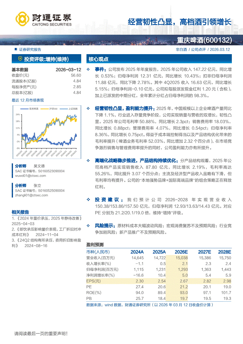 重庆啤酒:财通证券-重庆啤酒-600132-经营韧性凸显,高档酒引领增长-260312