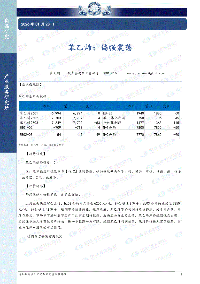 国泰君安期货-苯乙烯:偏强震荡-260128