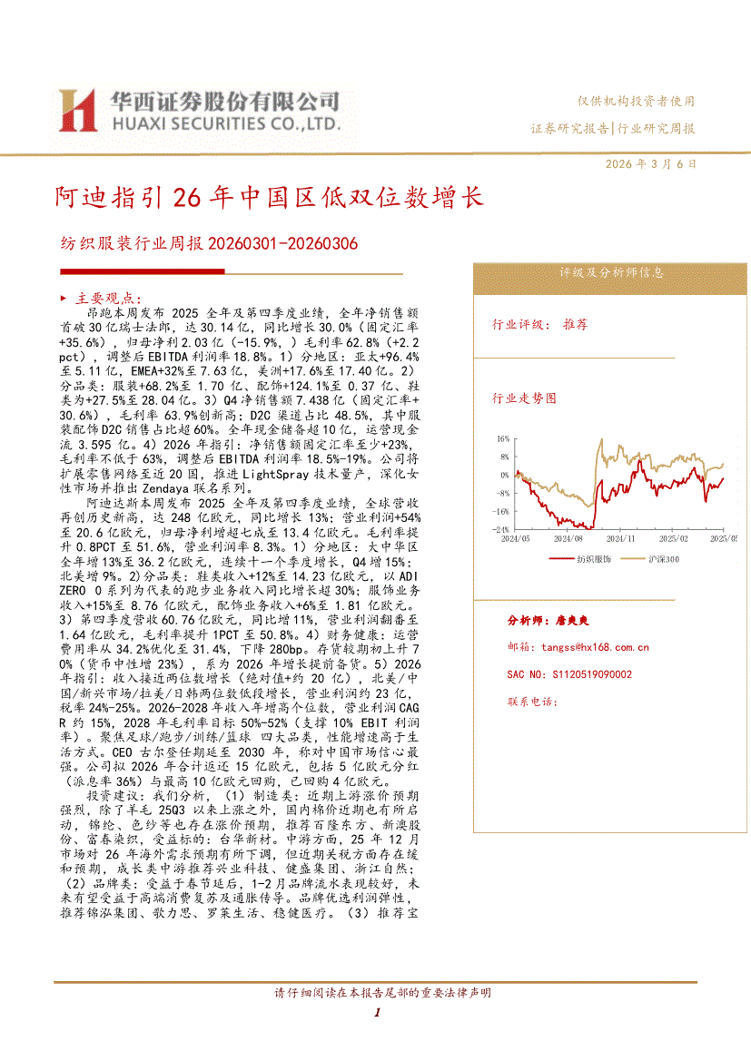 纺织服装行业:华西证券-纺织服装行业周报:阿迪指引26年中国区低双位数增长-260306