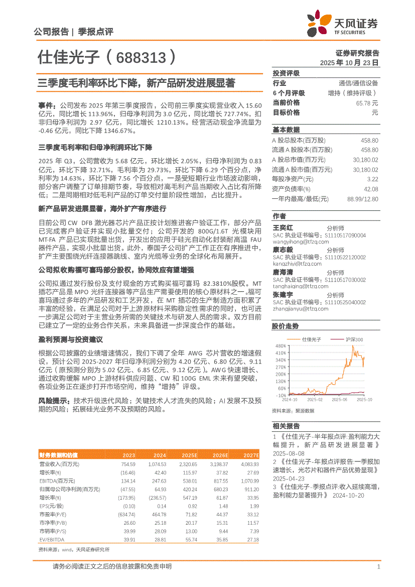 仕佳光子:天风证券-仕佳光子-688313-三季度毛利率环比下降,新产品研发进展显著-251023