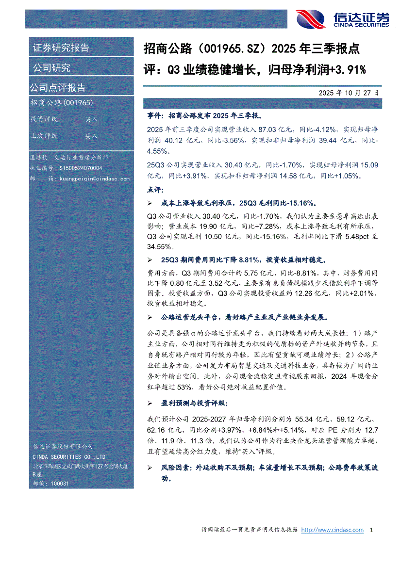招商公路:信达证券-招商公路-001965-2025年三季报点评:Q3业绩稳健增长,归母净利润+3.91%-251027
