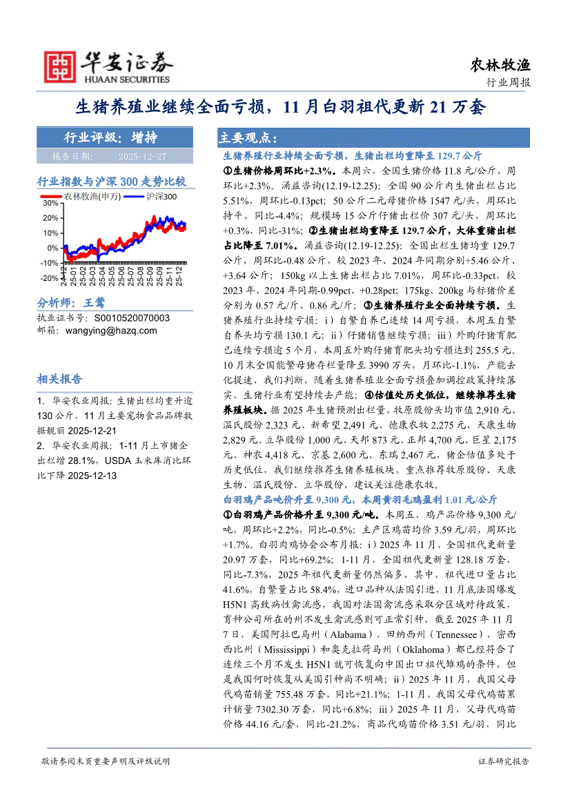 农林牧渔行业:华安证券-农林牧渔行业周报:生猪养殖业继续全面亏损,11月白羽祖代更新21万套-251227