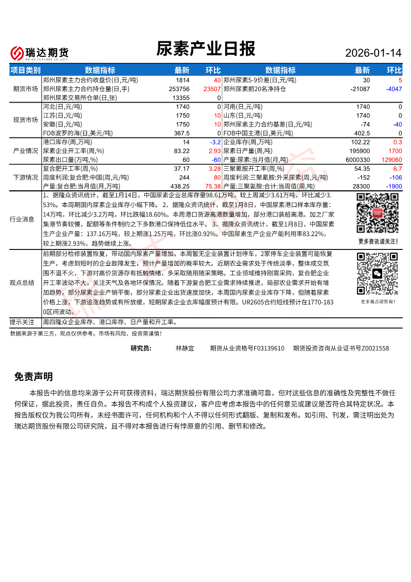 瑞达期货-尿素产业日报-260114