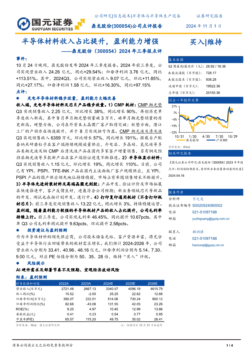 鼎龙股份:国元证券-鼎龙股份-300054-2024年三季报点评:半导体材料收入占比提升,盈利能力增强-241101