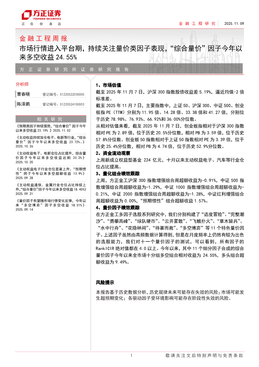 方正证券-金融工程周报:市场行情进入平台期,持续关注量价类因子表现,“综合量价”因子今年以来多空收益24.55%-251109