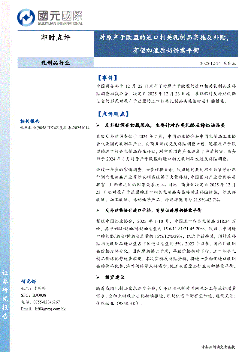国元国际-乳制品行业即时点评:对原产于欧盟的进口相关乳制品实施反补贴,有望加速原奶供需平衡-251224