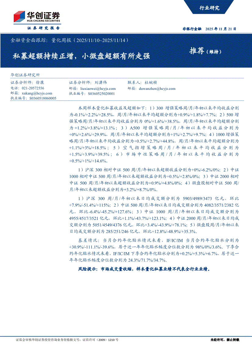 非银行金融行业:华创证券-非银行金融行业金融资金面跟踪:量化周报(20251110~20251114),私募超额持续正增,小微盘超额有所走强-251121