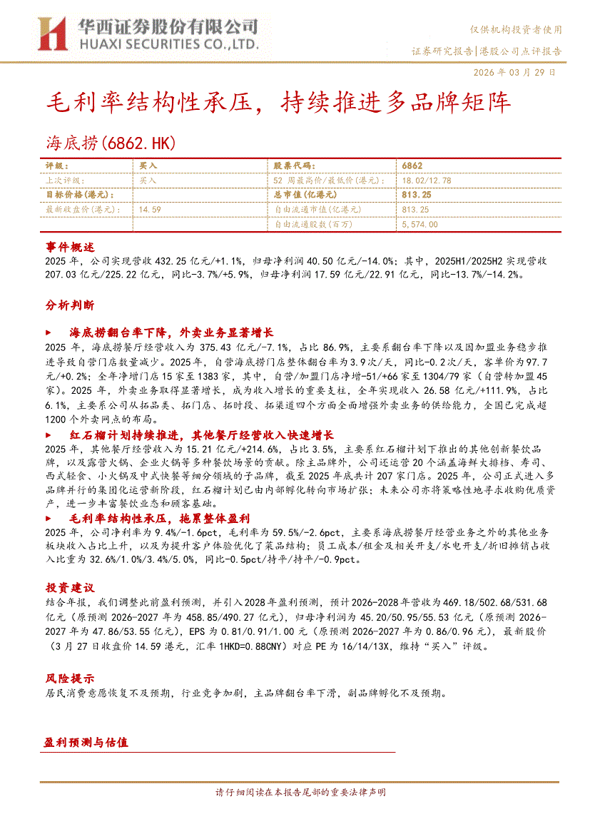 海底捞:华西证券-海底捞-6862.HK-毛利率结构性承压,持续推进多品牌矩阵-260329