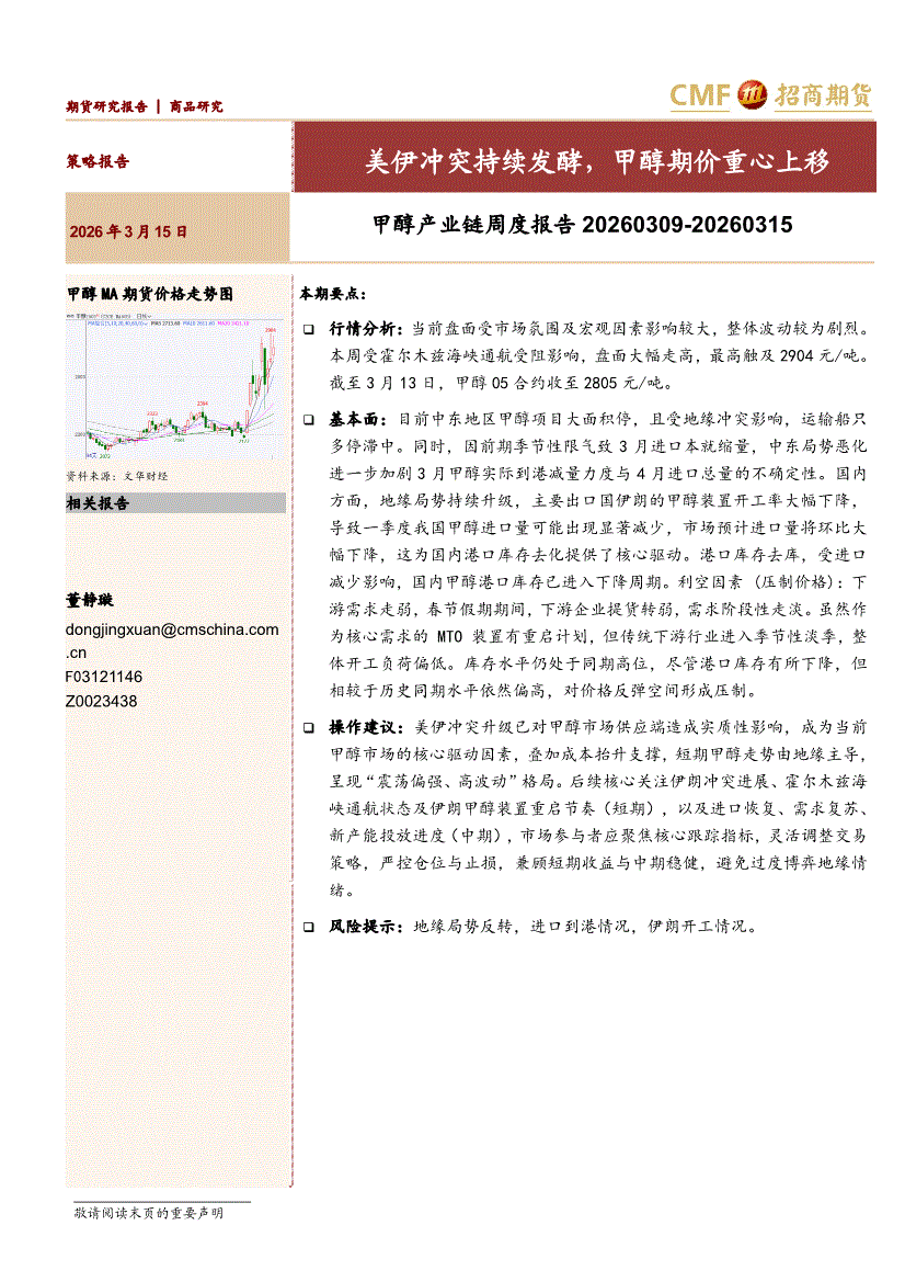 招商期货-甲醇产业链周度报告:美伊冲突持续发酵,甲醇期价重心上移-260315