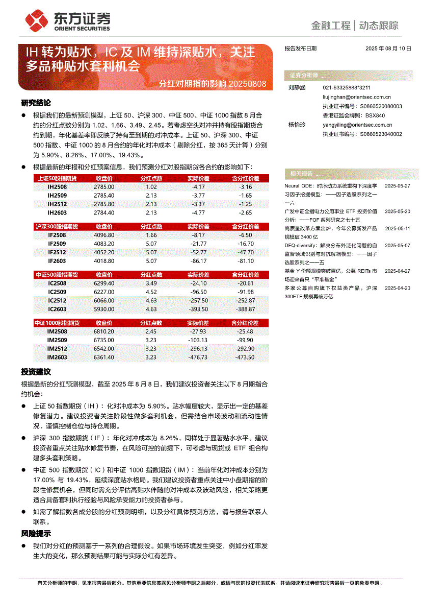 东方证券-分红对期指的影响:IH升水,IC及IM深贴水,关注大盘正向套利机会-250817