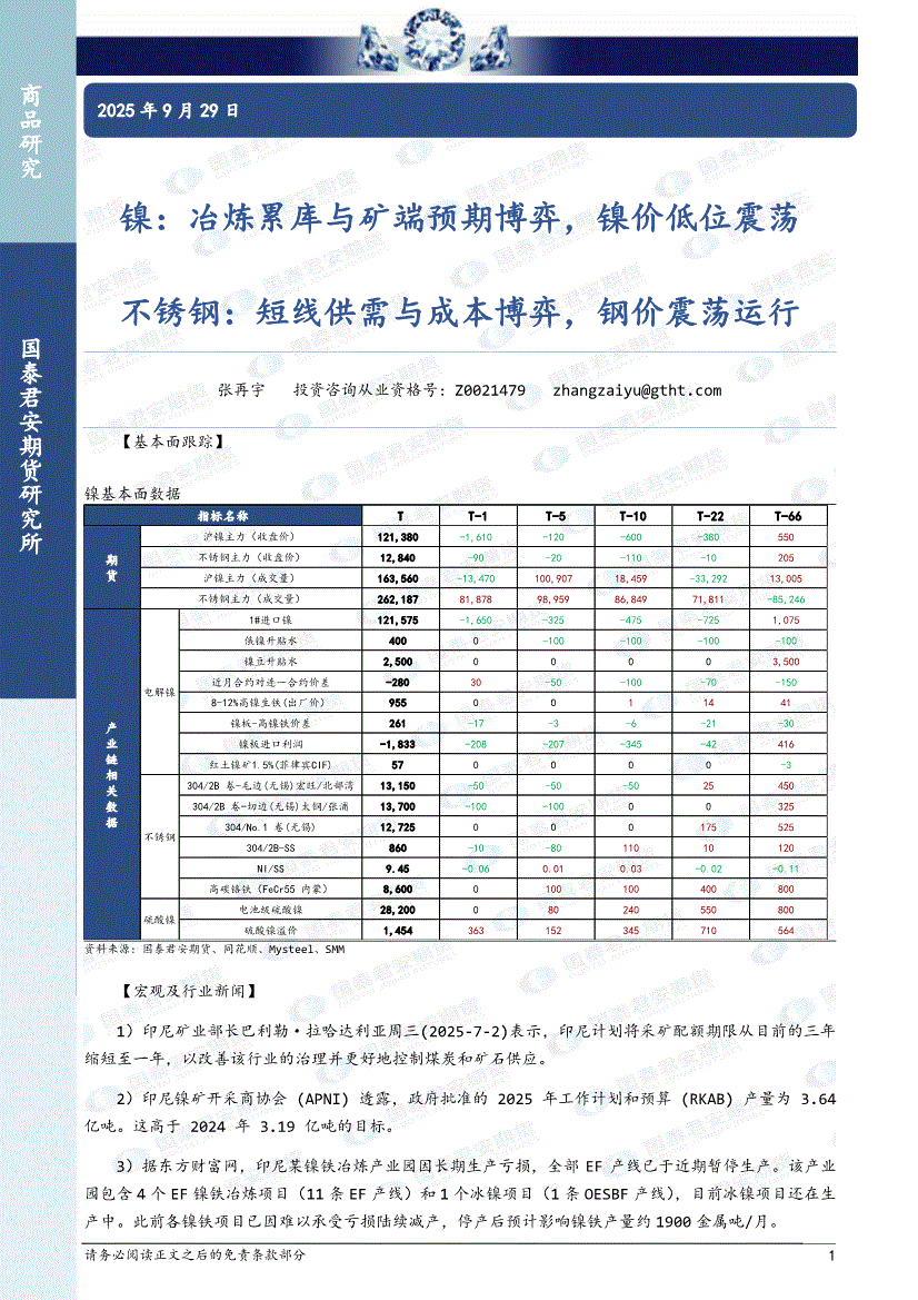 国泰君安期货-镍:冶炼累库与矿端预期博弈,镍价低位震荡,不锈钢,短线供需与成本博弈,钢价震荡运行-250929