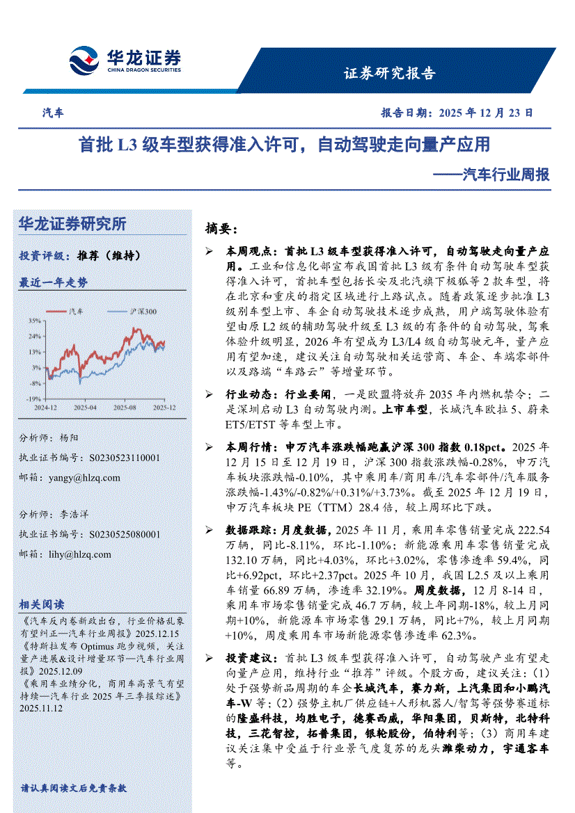 汽车行业:华龙证券-汽车行业周报:首批L3级车型获得准入许可,自动驾驶走向量产应用-251223