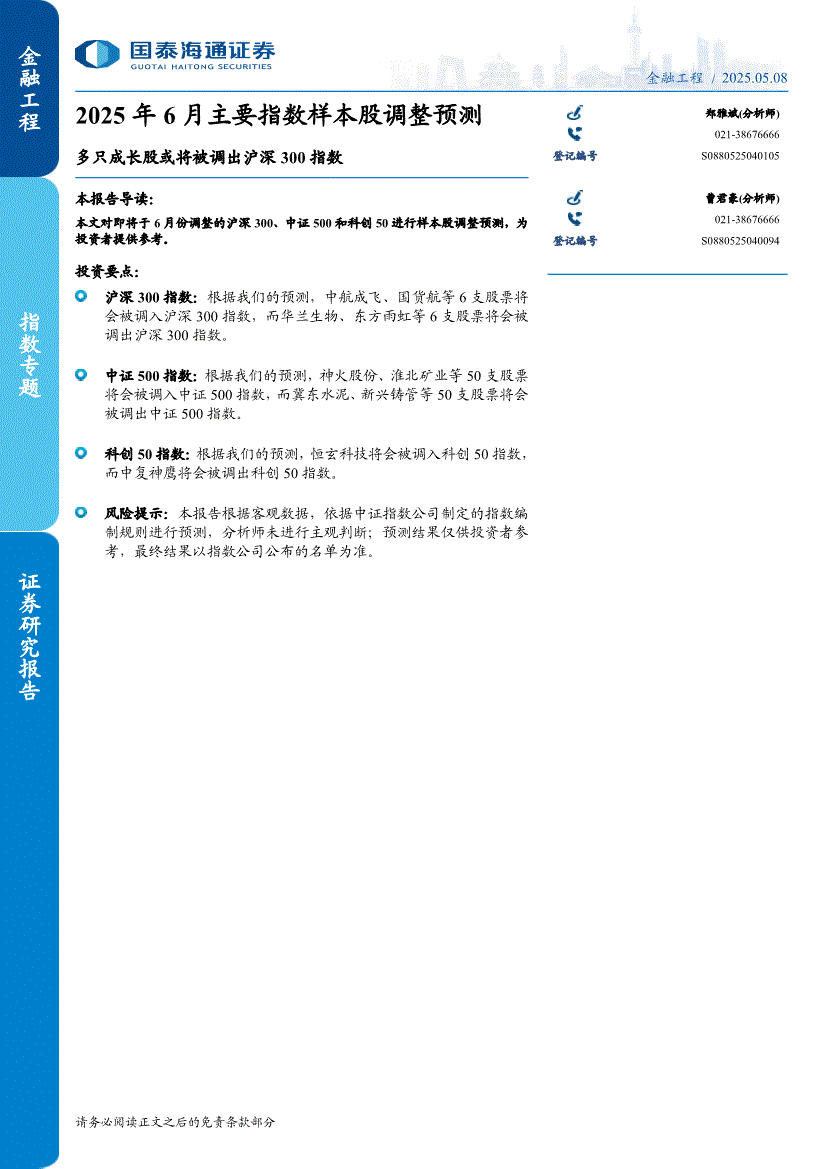 国泰海通证券-2025年6月主要指数样本股调整预测:多只成长股或将被调出沪深300指数-250508