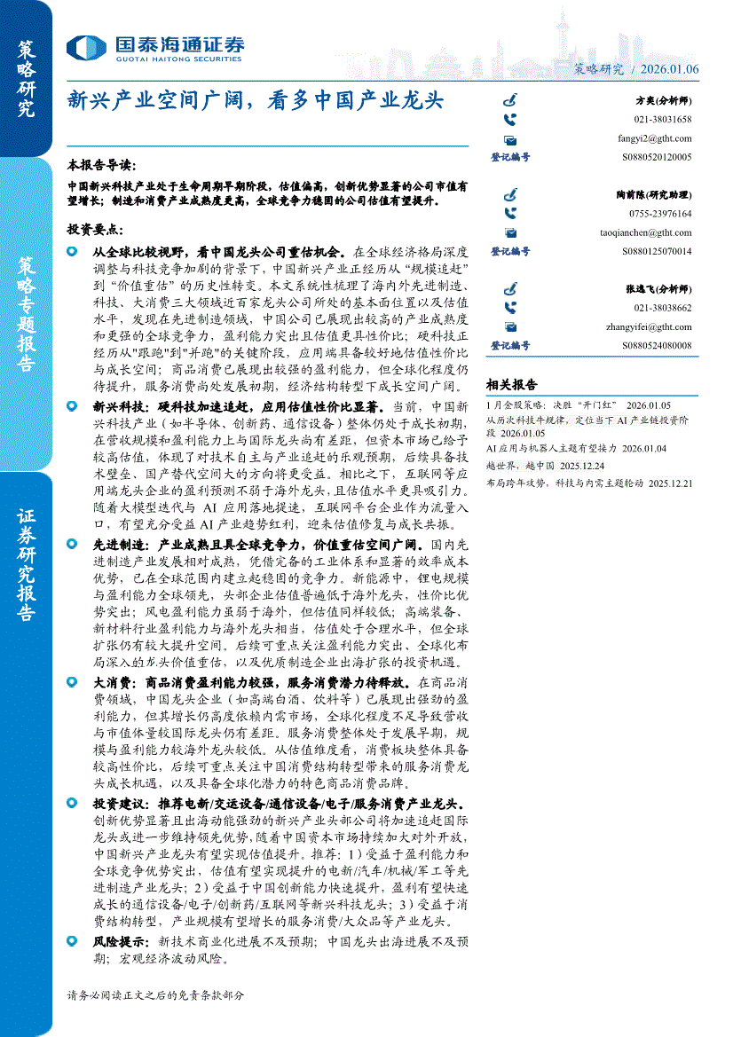 国泰海通证券-策略专题报告:新兴产业空间广阔,看多中国产业龙头-260106
