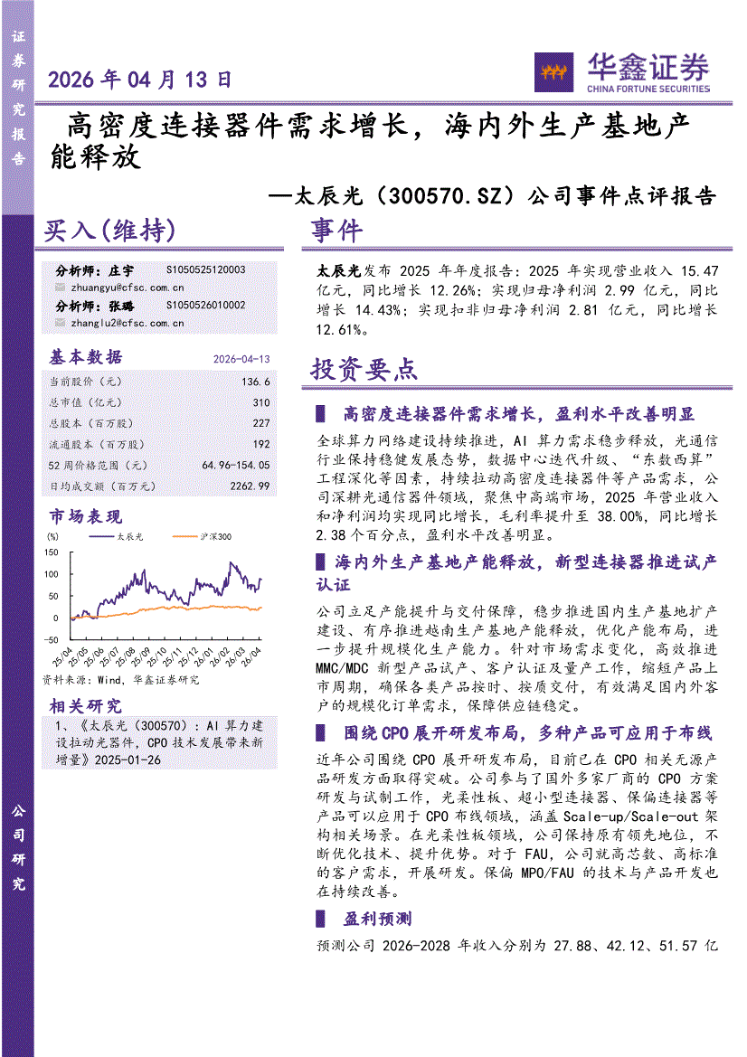 太辰光:华鑫证券-太辰光-300570-公司事件点评报告:高密度连接器件需求增长,海内外生产基地产能释放-260413