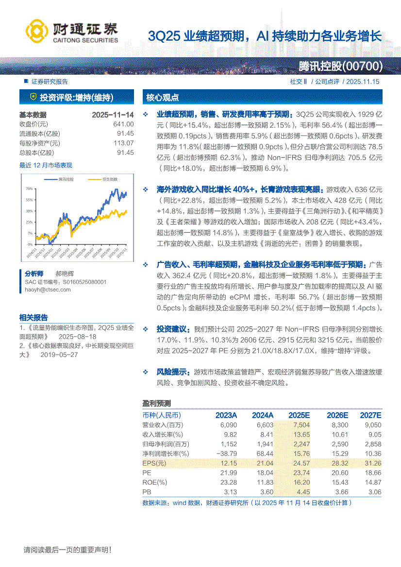 腾讯控股:财通证券-腾讯控股-0700.HK-3Q25业绩超预期,AI持续助力各业务增长-251115