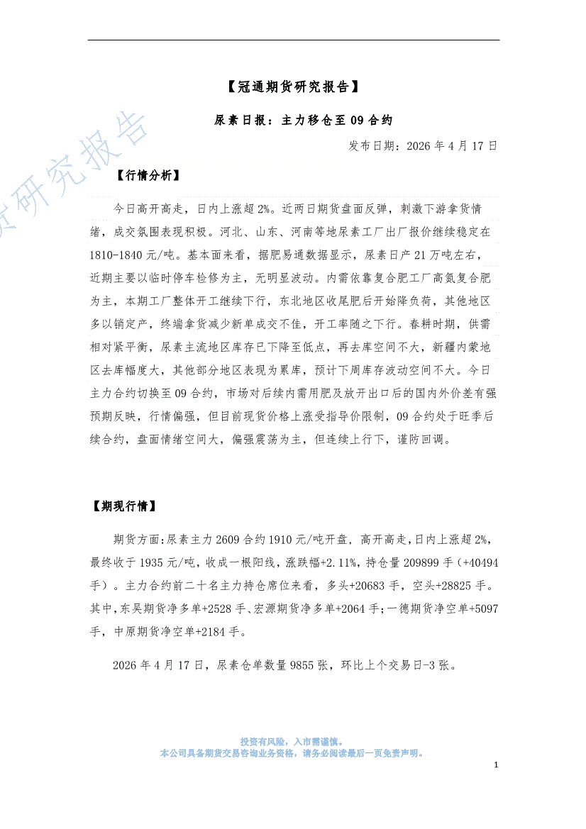 冠通期货-尿素日报:主力移仓至09合约-260417
