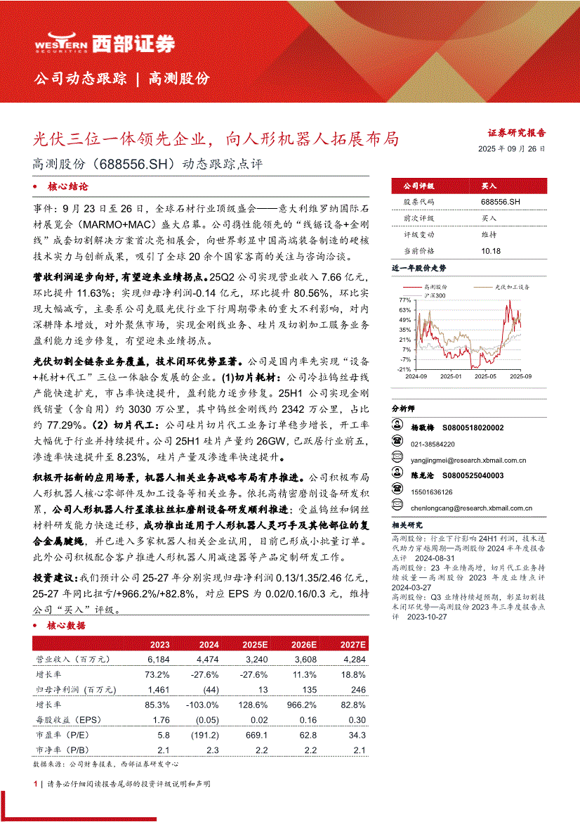 高测股份:西部证券-高测股份-688556-动态跟踪点评:光伏三位一体领先企业,向人形机器人拓展布局-250926