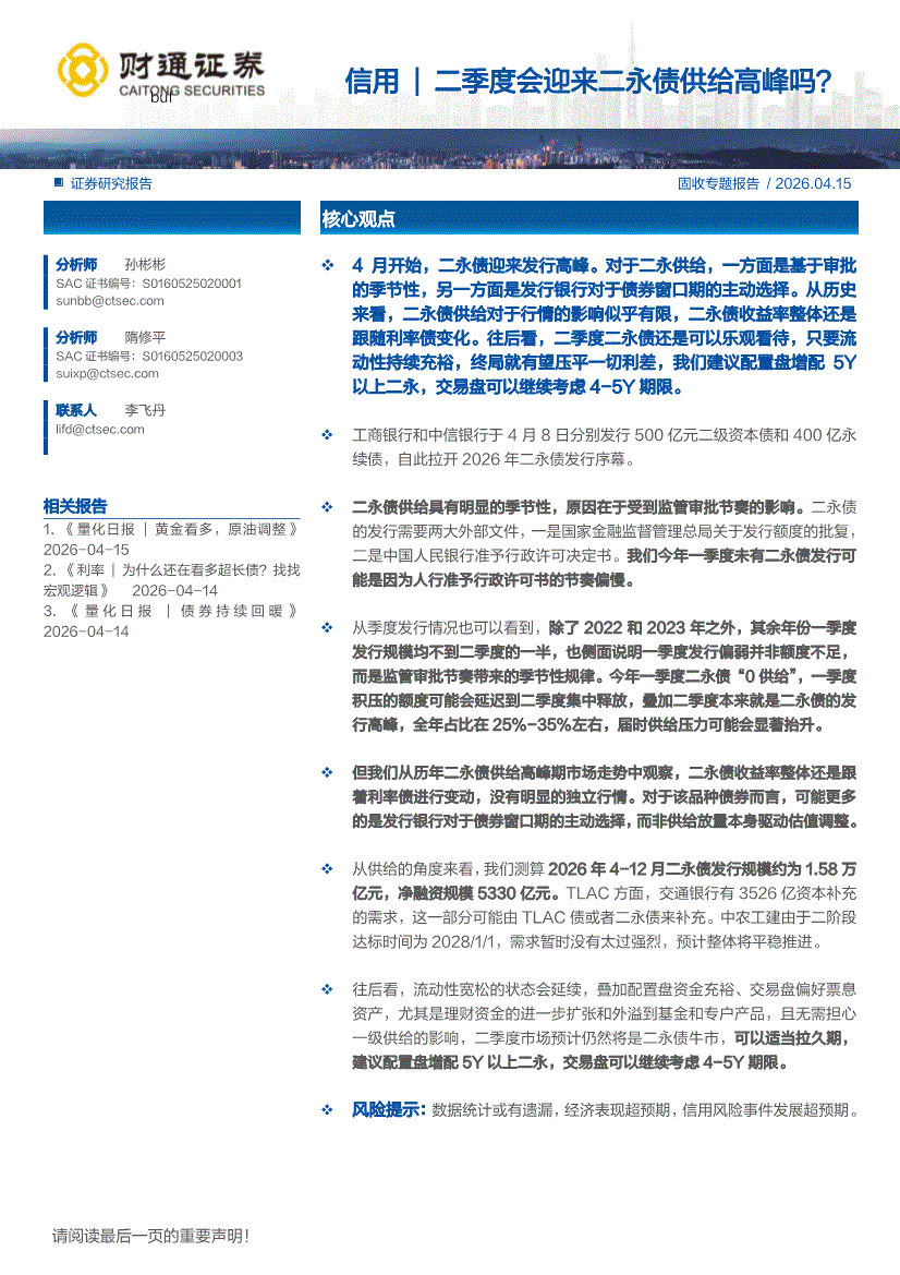 财通证券-信用|二季度会迎来二永债供给高峰吗?-260415