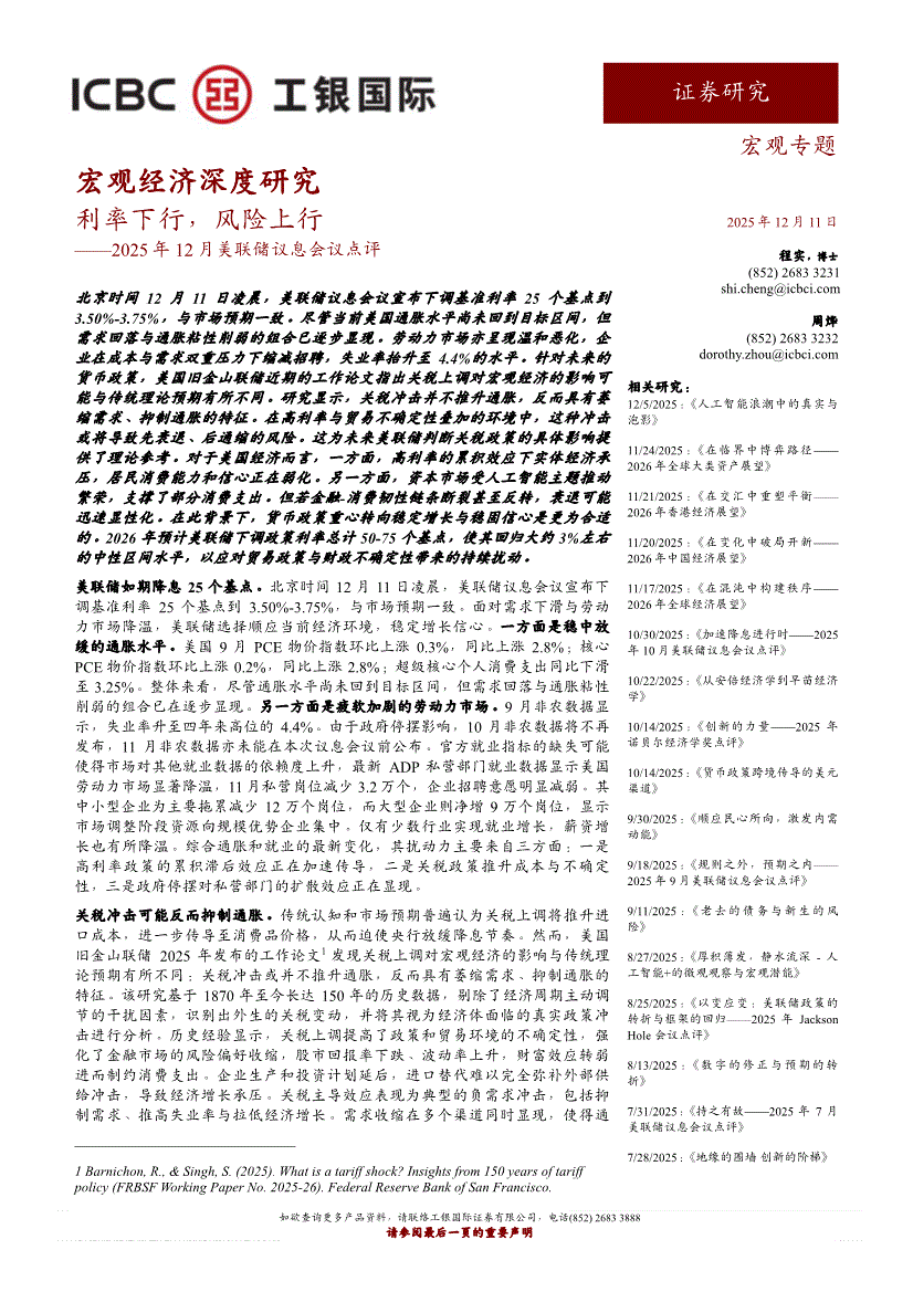 工银国际-2025年12月美联储议息会议点评:利率下行,风险上行-251211