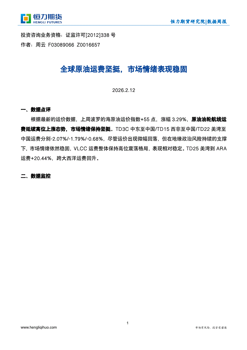 恒力期货-数据周报:全球原油运费坚挺,市场情绪表现稳固-260212