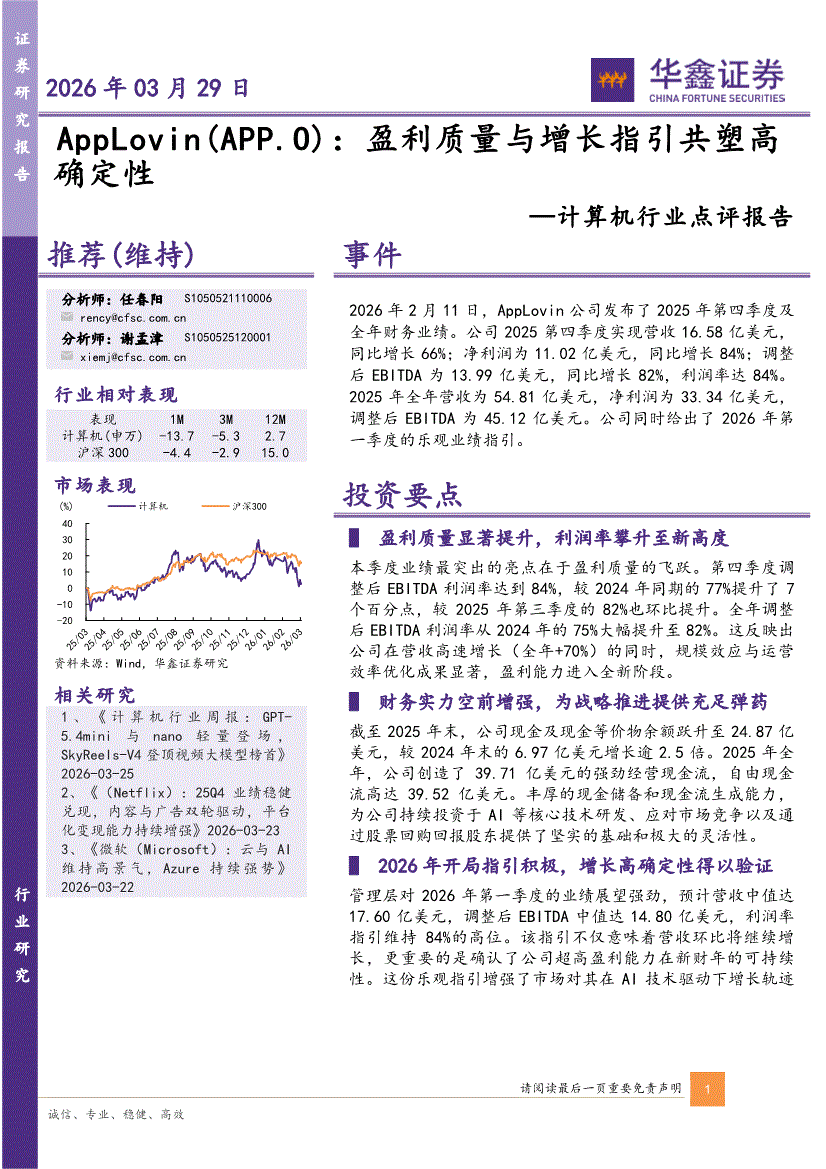 计算机行业:华鑫证券-计算机行业点评报告:AppLovin(APP.O),盈利质量与增长指引共塑高确定性-260329