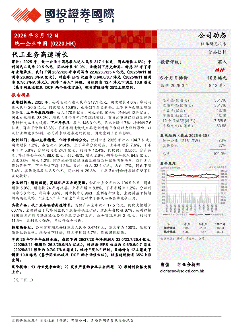 统一企业中国:国投证券国际-统一企业中国-0220.HK-代工业务高速增长-260312
