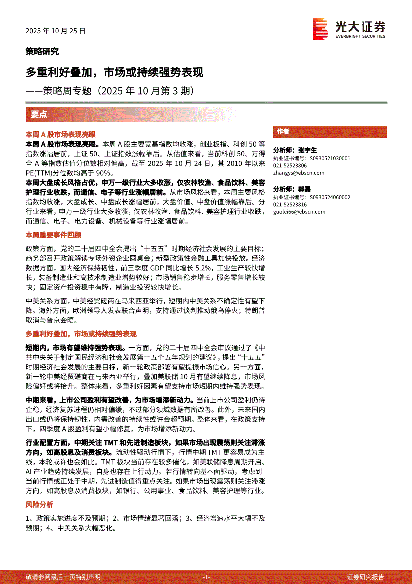 光大证券-策略周专题(2025年10月第3期):多重利好叠加,市场或持续强势表现-251025