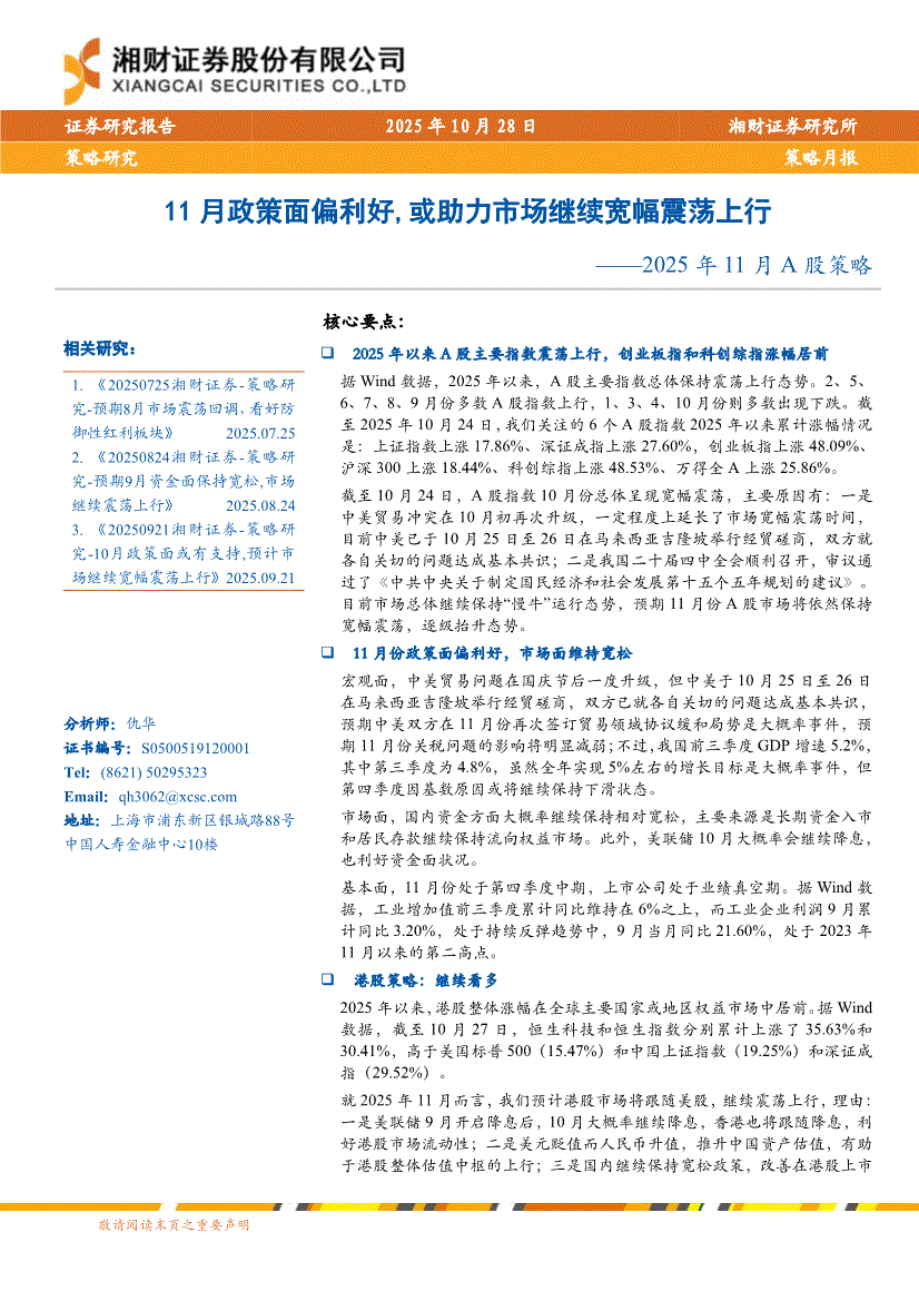 湘财证券-2025年11月A股策略:11月政策面偏利好,或助力市场继续宽幅震荡上行-251028