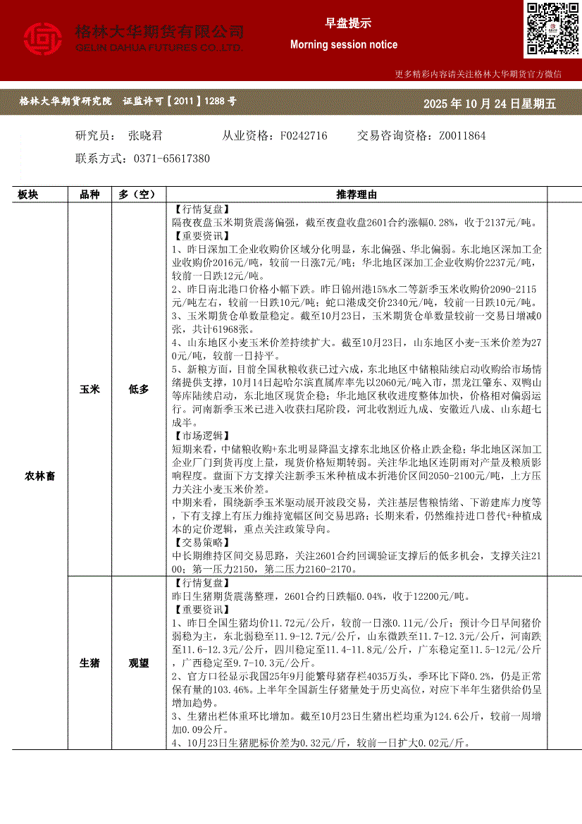 格林大华期货-早盘提示:玉米生猪鸡蛋-251019