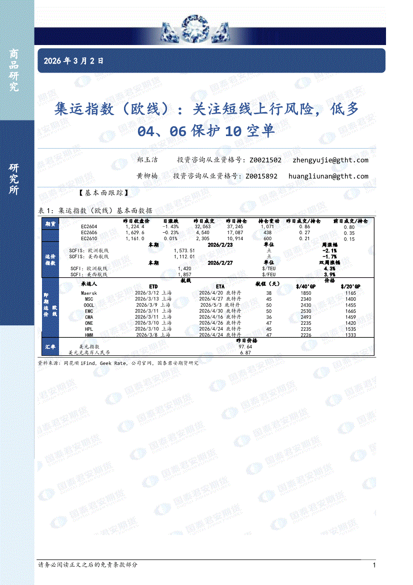 国泰君安期货-集运指数(欧线):关注短线上行风险,低多04、06保护10空单-260302
